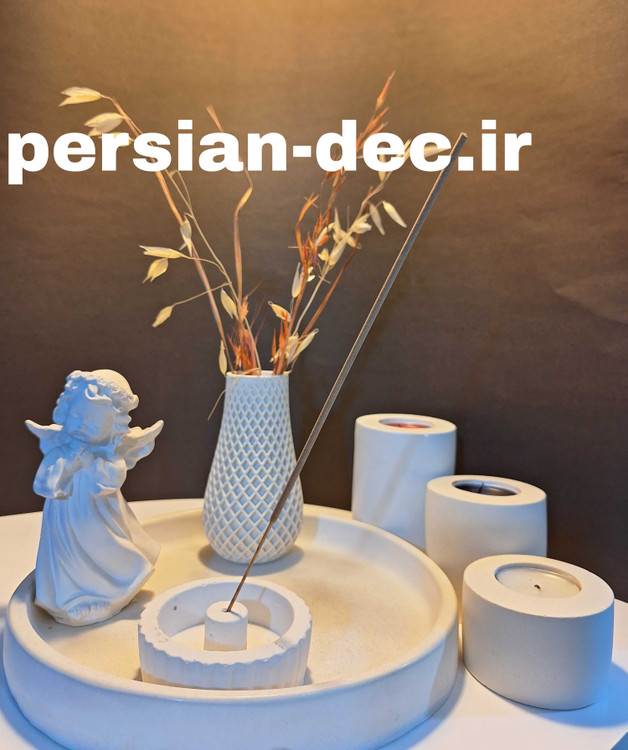 ست تزیئینی و دکوری سنگ مصنوعی فرشته 1 شامل سینی گرد ، گلدان زنبوری ، جاعدی گرد ، ست جاشمعی استوانه و گلدان فرشته