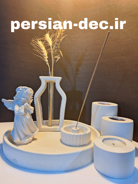 ست فرشته 2 شامل یک عدد سینی گرد ،یک عدد گلجای کوزه ای بزرگ با ارتفاع 16 سانتی متری ،جاعودی گرد ،مجسنه فرشته و سه عدد جاشمعی استوانه سنگ مصنوعی