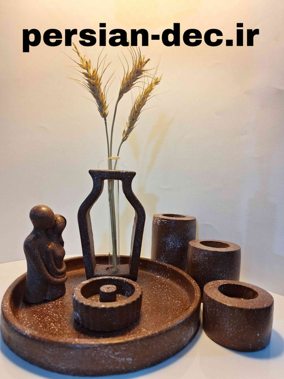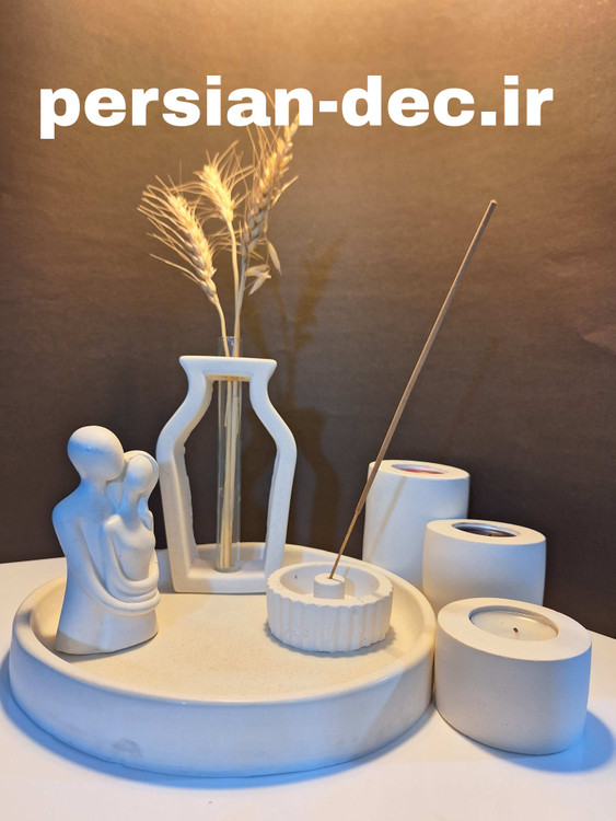 ست زوج 2 شامل یک عدد سینی گرد ،یک عدد گلجای کوزه ای بزرگ 16 سانتی متری ،جاعودی گرد ،مجسنه زوج و سه عدد جاشمعی استوانه سنگ مصنوعی